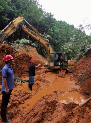 隨后,市政集團(tuán)搶險救援突擊隊接到了搶修澄邦村村道的任務(wù),短短5公里3米寬的村道,每幾十米就有一個坍塌,大型的拖車無法將挖掘機運送至村里進(jìn)行搶險救災(zāi)。經(jīng)過突擊隊現(xiàn)場研究,制定了采用小型挖掘機一邊先行搶修道路一邊往澄邦村前行的方案,最后挖掘機用了5小時到達(dá)村里開始搶險工作。